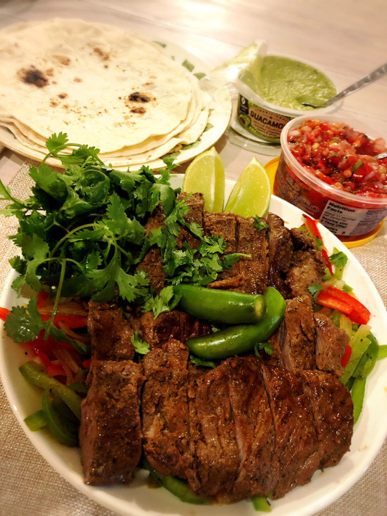 また、こんな感じでトルティーヤ、シラントロ(パクチー)、ライム、サルサ、ワカモレを用意すると簡単におうちファヒータ(Fajita)ができます。
