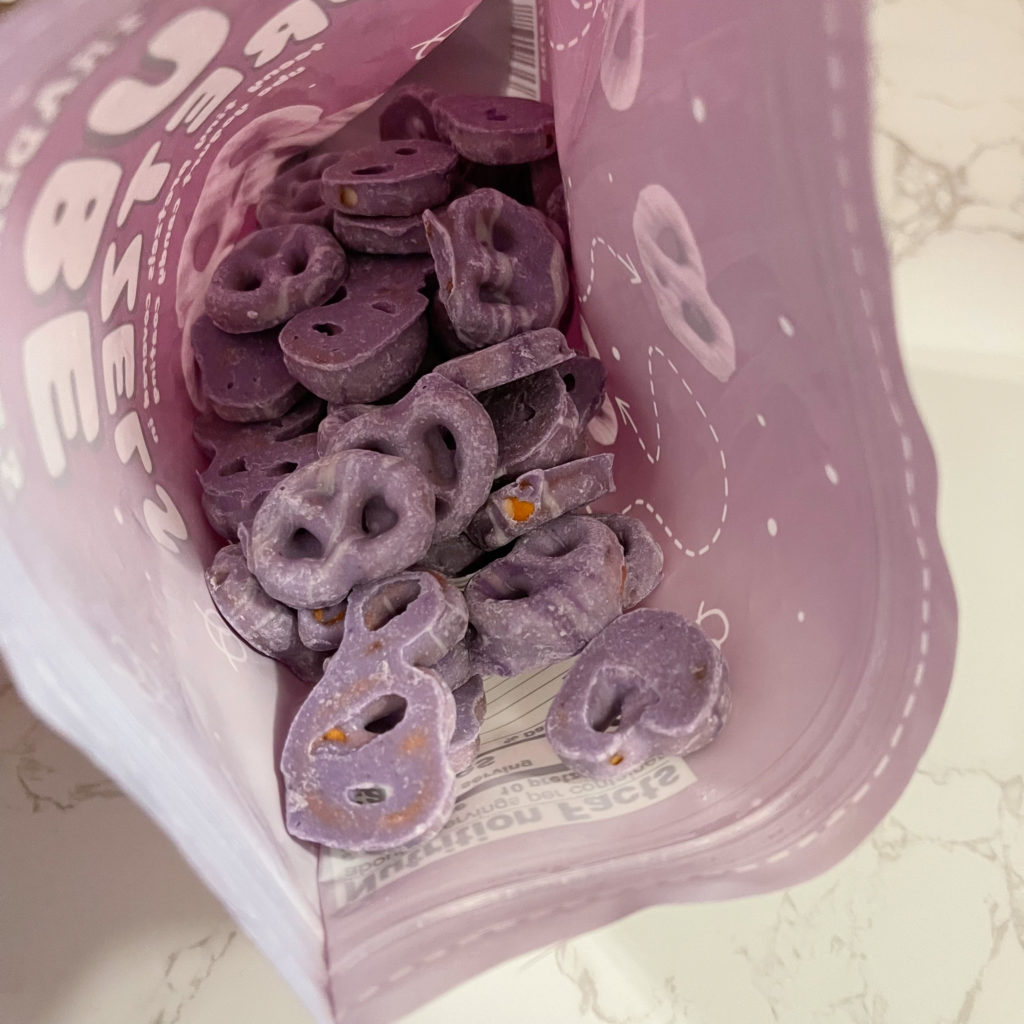 ウベヨーグルト味のチョコレートがコーティングされています。