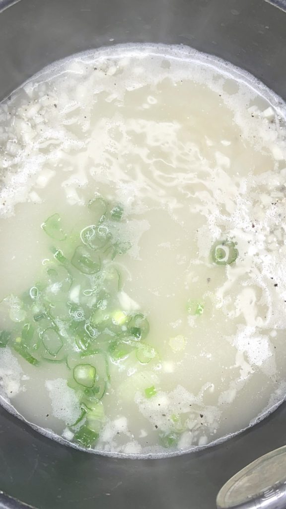 4,細かく刻んだガーリックとネギを入れて、塩と胡椒で味を整えます。